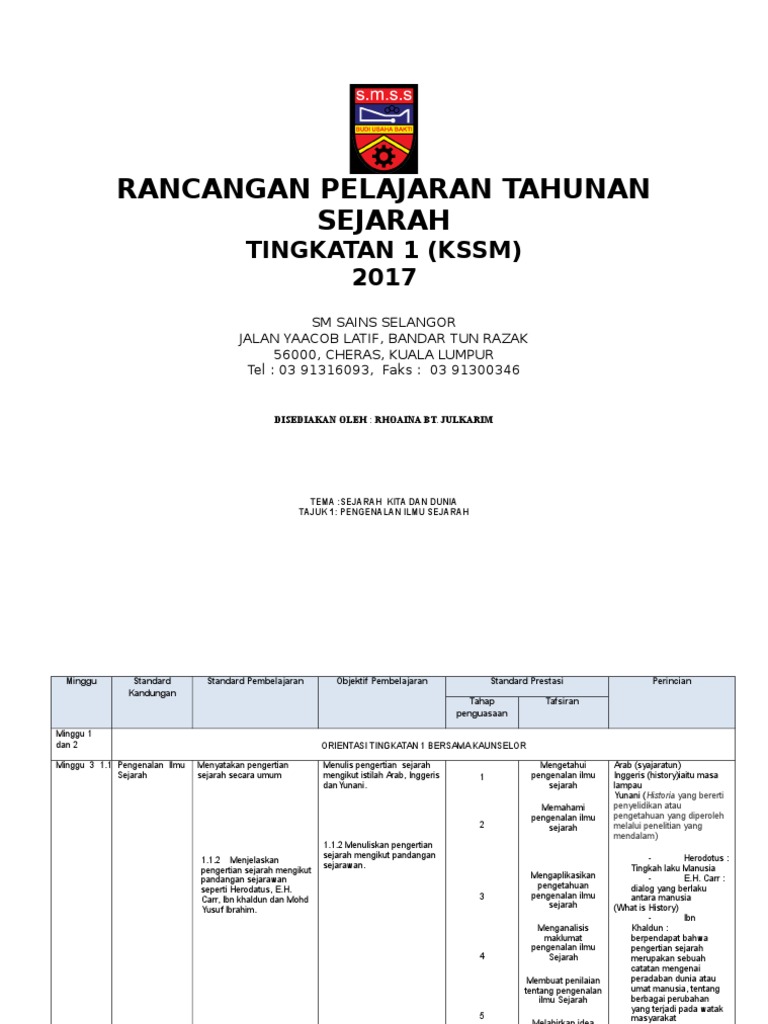 Rancangan Pelajaran Tahunan Sejarah Tingkatan 1 Tahun 2018 Terbaru Docx