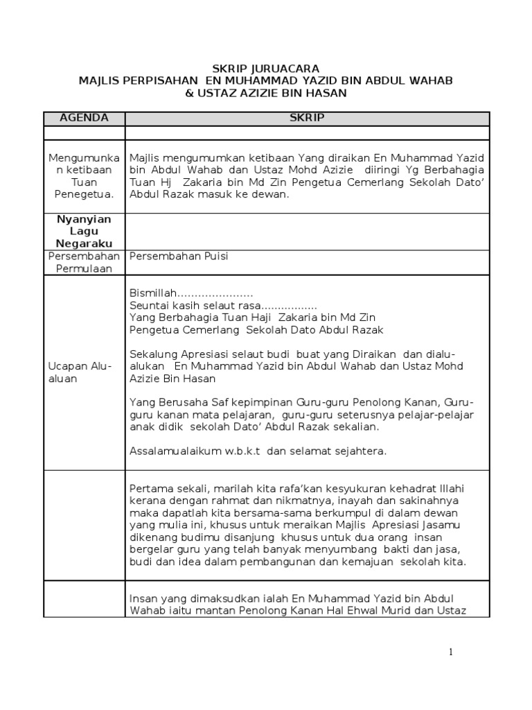 Skrip Juruacara Majlis Perpisahan En Muhammad Yazid Bin Abdul Wahab Ustaz Azizie Bin Hasan Agenda Skrip