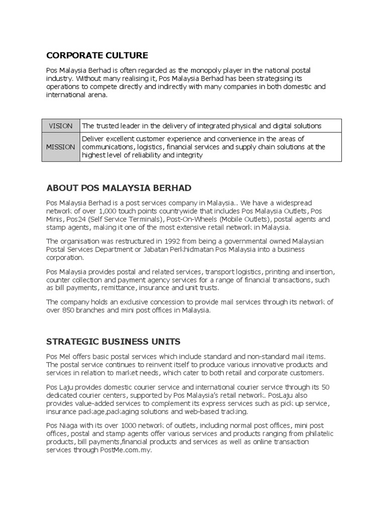 273964651 Case Study Docx Pos Malaysia 1 Background Pos Malaysia Berhad Is Malaysia U2019s Premier Postal Service Provider We Have A Widespread Network Course Hero