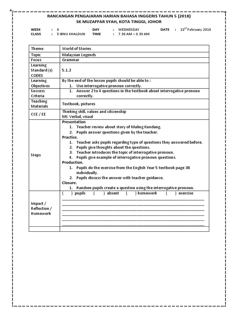 Rancangan Pengajaran Harian Bahasa Melayu Tahun 5