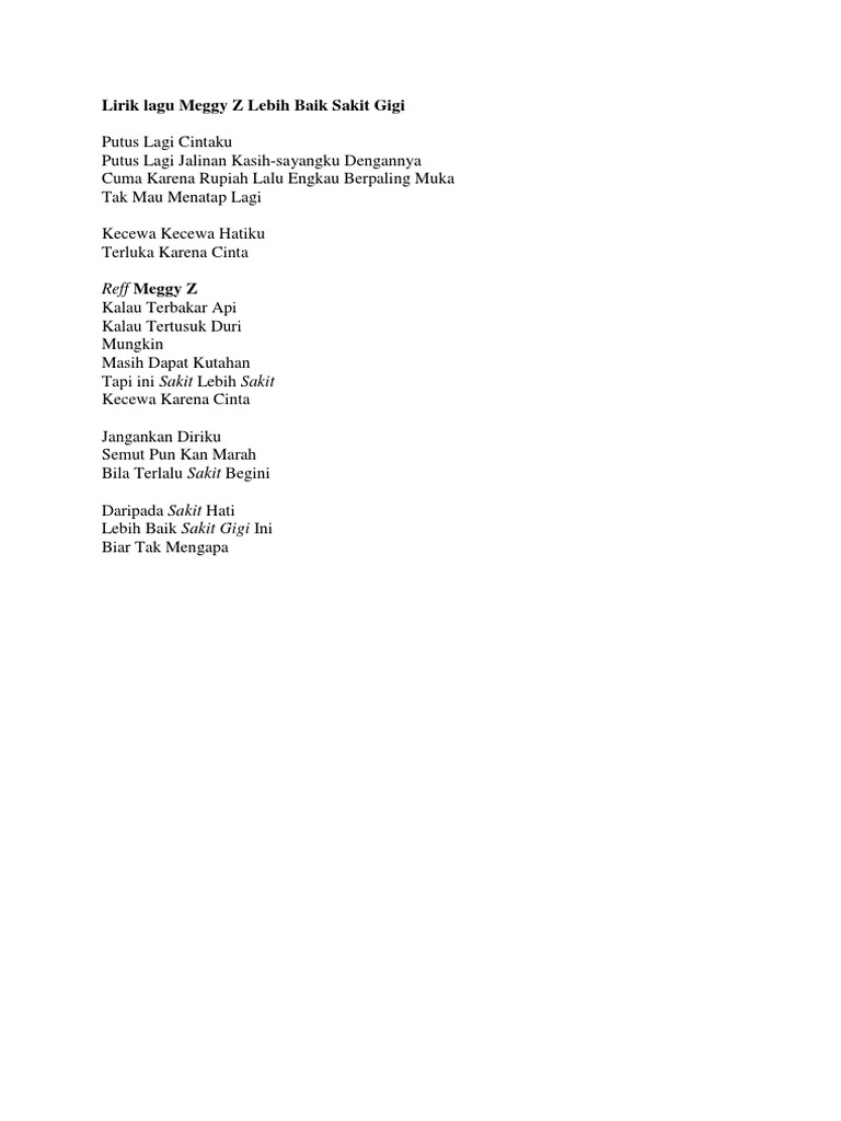 Sakit yang ku rasakan mengaburi jiwa ini dendam yang kau berikan cukup di sini o mengapa mudahnya kau sakiti h mengapa mudahnya kau lukai l mengapa kejamnya kau menghancurkan i hati perasaan ini r i putih bersih cintaku k kau racuni hingga mati. Lirik sakit hati oleh meggy z. Lirik lagu sakit i am neeta.