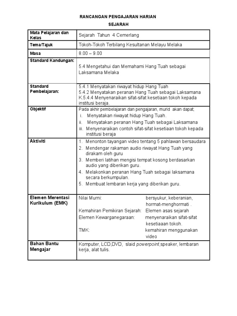 Rancangan Pengajaran Harian Tahun 4 Hang Tuah