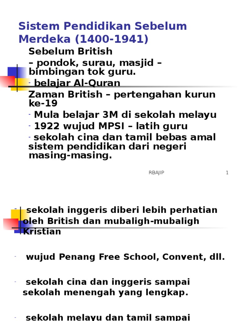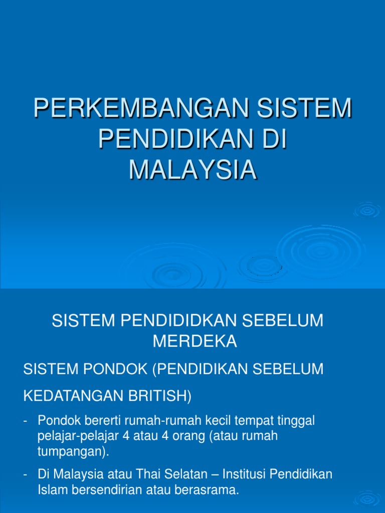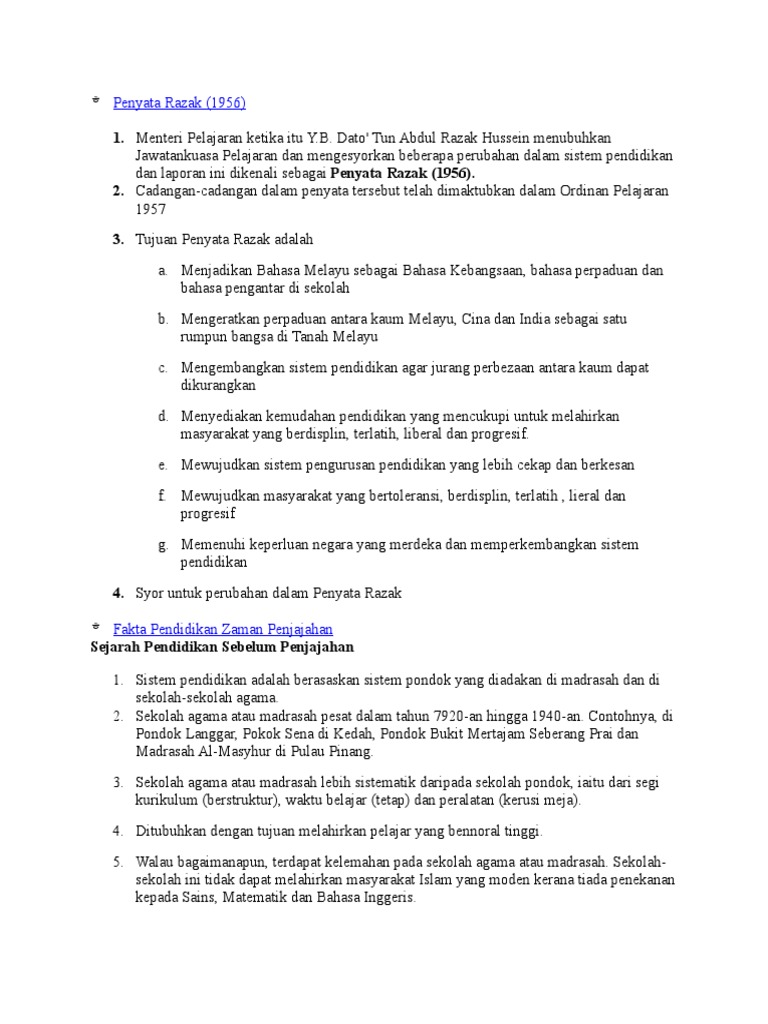 Sistem pendidikan di tanah melayu sebelum merdeka sistem pendidikan di malaysia sejak awal 1900 hingga penyata razak. Sistem pendidikan sebelum merdeka sistem pendidikan selepas merdeka sistem pendidikan yang terhad hanya memberikan pendidikan untuk menguasai ilmu pengetahuan asas iaitu membaca menulis dan mengira sistem pendidikan bertaraf dunia penggunaan ict ilmu pengetahuan yang lebih bertumpu atau dipengaruhi oleh negara asal sukatan pelajaran dan sistem peperiksaan yang sama upsr pmr spm dan stpm sistem pendidikan yang tidak mementingkan pencapaian ko kurikulum pelajar sistem pendidikan yang. Sistem pengajian pondok selepas merdeka jika disoroti sejenak pendidikan islam sebenarnya telah beroperasi di bawah zaman penjajahan selama lebih 400 tahun sehinggalah muncul penyata razak 1956 dan penyata rahman talib 1960.