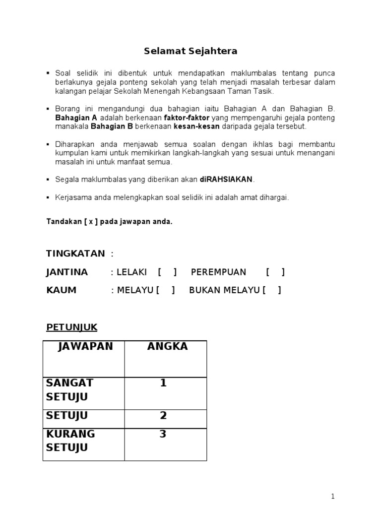 Doc Borang Soal Selidik Pengurusan Ponteng Sekolah Dan Pengaruhnya Terhadap Masalah Ponteng Dalam Kalangan Pelajar Sekolah Rendah Di Daerah Kota Belud Evy Ang Academia Edu